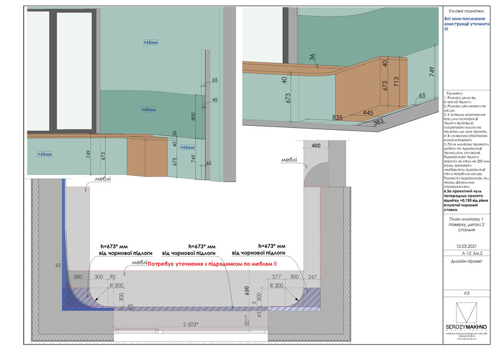 This project has one difference that is valuable for experience. The walls and ceilings in Mureli House are rounded like the sides of an apricot. This was a challenge for me as an architect and the general contractors. We developed as many transitions as were needed for the perfect shape. They also found a way to make shadow seams on the floor and ceiling. The final result required templates, according to which the craftsmen cut the drywall and mounted it. They made it possible to perfectly fit all the cabinet furniture into these radius walls. The drawings made while working on this project are framed on the wall.